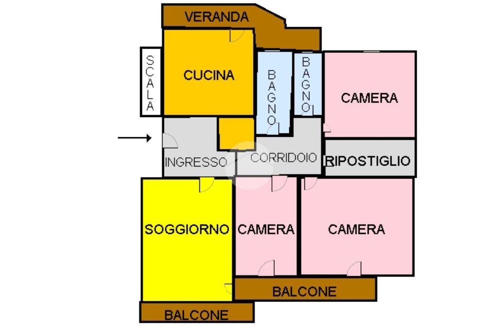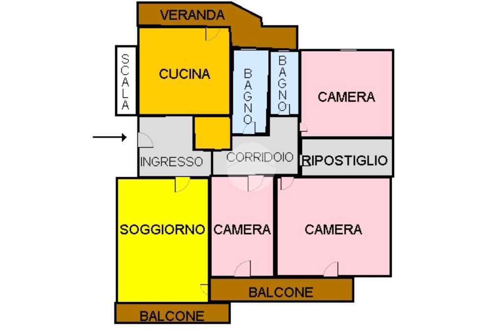 L'ingresso sfocia su un accogliente soggiorno dotato di balcone, mentre il corridoio divide la zona giorno dalla zona notte,quest'ultima caratterizzata da due camerette e una camera da letto.